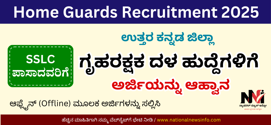 Home Guard Jobs : ಉತ್ತರ ಕನ್ನಡ ಜಿಲ್ಲಾ ಗೃಹರಕ್ಷಕ ದಳ ಇಲಾಖೆಯಿಂದ (Home Guards Recruitment 2025) ಖಾಲಿ ಇರುವ 140 ಹುದ್ದೆಗಳಿಗೆ ಅರ್ಜಿಯನ್ನು ಆಹ್ವಾನಿಸಲಾಗಿದೆ. ಹುದ್ದೆಗಳ ನೇಮಕಾತಿಗಾಗಿ ಆನ್ಲೈನ್ ಅರ್ಜಿಗಳನ್ನು ಆಹ್ವಾನಿಸಲಾಗಿದೆ. ಆನ್ಲೈನ್ ಮೂಲಕ ಅರ್ಹ ಮತ್ತು ಆಸಕ್ತ ಅಭ್ಯರ್ಥಿಗಳಿಂದ ಅರ್ಜಿಗಳನ್ನು ಆಹ್ವಾನಿಸಲಾಗಿದೆ. ಕೆಳಗೆ ಅಧಿಕೃತ ಅಧಿಸೂಚನೆ ಲಿಂಕ್ ಹಾಗೂ ಅಧಿಕೃತ ವೆಬ್ಸೈಟ್ ಲಿಂಕ್ ಮೂಲಕ