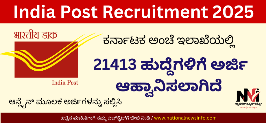 India Post Jobs :ಕರ್ನಾಟಕ ಅಂಚೆ ಇಲಾಖೆಯಲ್ಲಿ (India Post Recruitment 2025) ನಲ್ಲಿ ಖಾಲಿ ಇರುವ 21413 ಹುದ್ದೆಗಳಿಗೆ ಅರ್ಜಿಯನ್ನು ಆಹ್ವಾನಿಸಲಾಗಿದೆ. ಹುದ್ದೆಗಳ ನೇಮಕಾತಿಗಾಗಿ ಆನ್ಲೈನ್ ಅರ್ಜಿಗಳನ್ನು ಆಹ್ವಾನಿಸಲಾಗಿದೆ. ಆನ್ಲೈನ್ ಮೂಲಕ ಅರ್ಹ ಮತ್ತು ಆಸಕ್ತ ಅಭ್ಯರ್ಥಿಗಳಿಂದ ಅರ್ಜಿಗಳನ್ನು ಆಹ್ವಾನಿಸಲಾಗಿದೆ. ಕೆಳಗೆ ಅಧಿಕೃತ ಅಧಿಸೂಚನೆ ಲಿಂಕ್ ಹಾಗೂ ಅಧಿಕೃತ ವೆಬ್ಸೈಟ್ ಲಿಂಕ್ ಮೂಲಕ ನೇಮಕಾತಿ ಕುರಿತ ಹೆಚ್ಚಿನ ಮಾಹಿತಿಯನ್ನು ಕೆಳಗಿನಂತೆ ನೀಡಲಾಗಿದೆ.